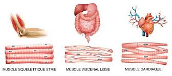 Nous avons trois types de muscles: les muscles striés squelettiques (ceux que nous utilisons pour bouger), les muscles lisses (ceux présent au niveau de nos viscères), le muscle strié cardiaque ( le muscle du cœur).