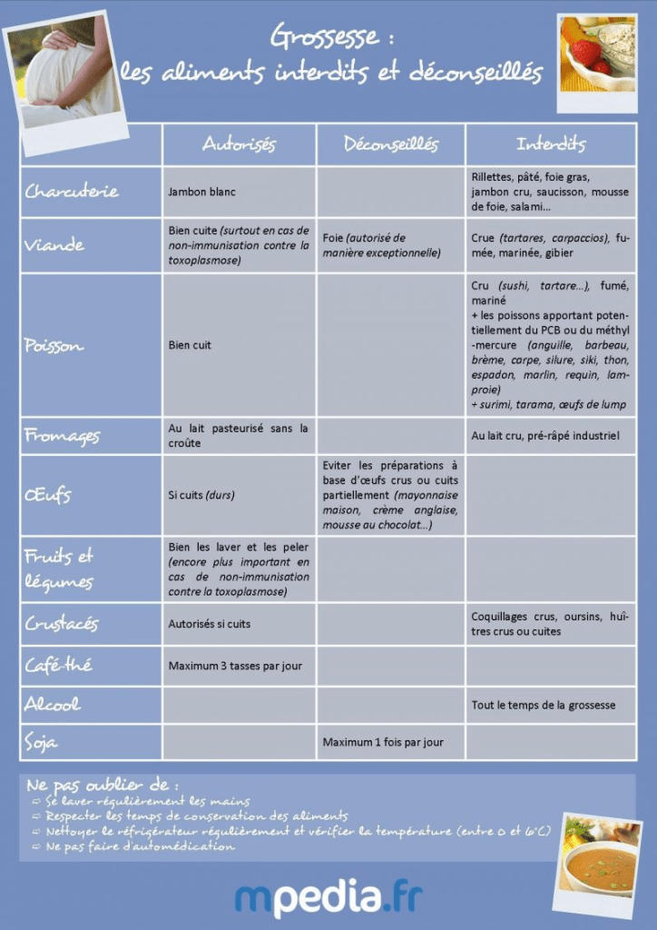 - Grossesse, quels aliments sont autorisés ? (https://www.mpedia.fr/art-aliments-interdits-deconseilles/ )